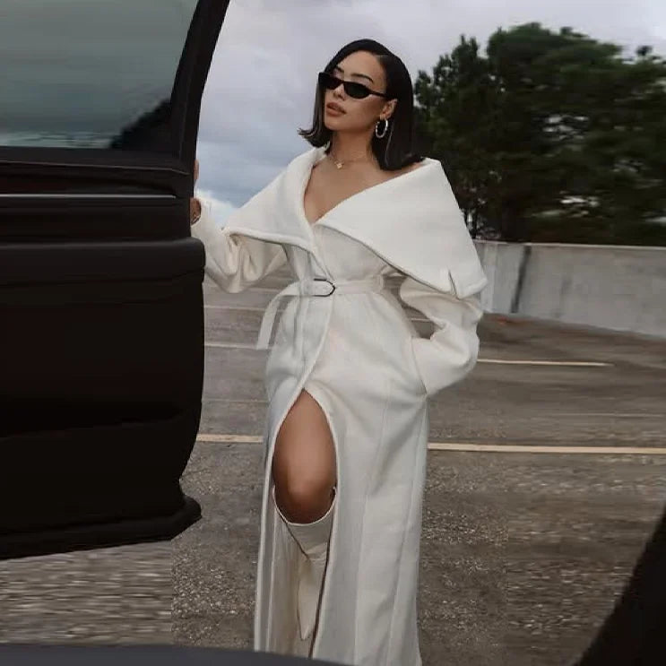 Women Stylish Elegant Woolen Belted Coat High-end Office Ladies Sophisticated Modest Trendy Long Outerwear