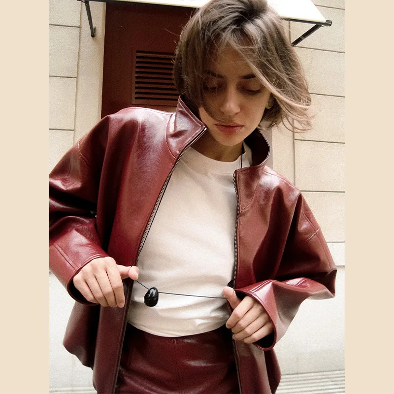 Model Number: Vintage Green Leather Jacket Skirt Set Women