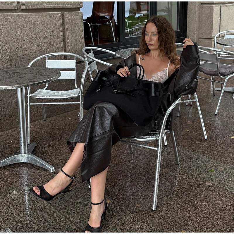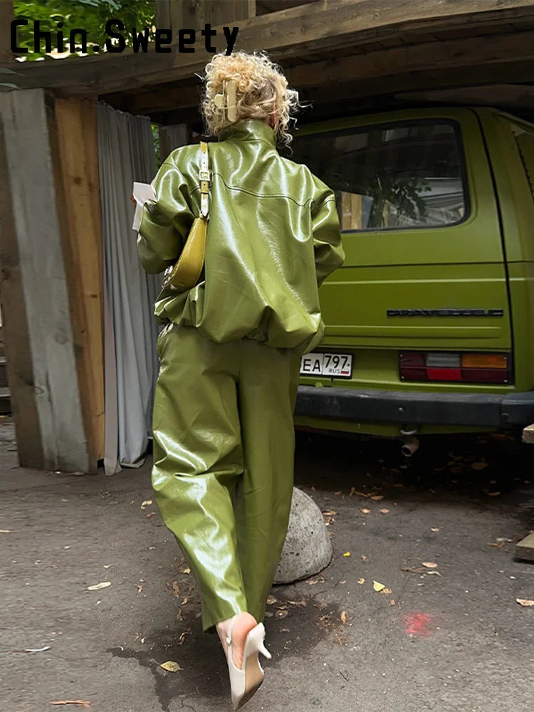 Women's Vintage Green Leather Jacket Skirt Set Full Sleeve Zipper Locomotive Coat Hip Package Long Skirts Autumn Outfits