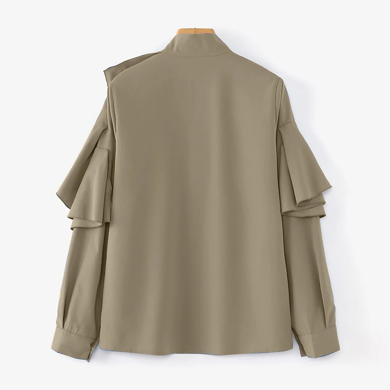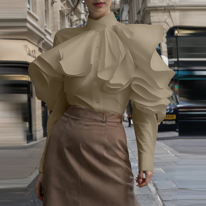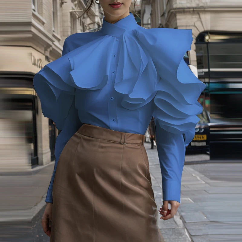 Women's White Elegant Office Lady Bouses Ruffled Stitching Long Sleeve Tops Casual Loose Buttons Streetwer